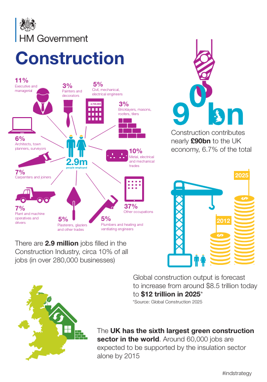 The global construction market is predicted to grow by over 75% in the next 10 years, offering large opportunities for UK businesses operating in this sector. Construction contributes nearly £90bn to the UK economy, which is 6.7% of the total. The UK government also supports growth in the UK construction industry – it’s a huge opportunity, which already fuels 2.9 million jobs.