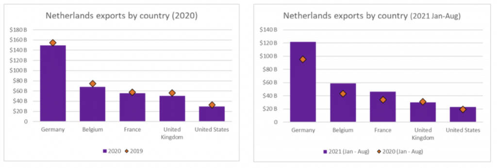 The main export destinations are Germany (around $115B), Belgium-Luxembourg ($90B), the United Kingdom ($52B), France ($33B) and Italy ($26B).