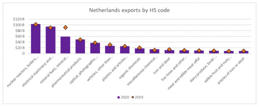 Dutch exports are dominated by a few key categories: machinery and transport equipment (28%), mineral fuels (23%), food (11%), clothing and footwear (10%), and pharmaceuticals (5%)