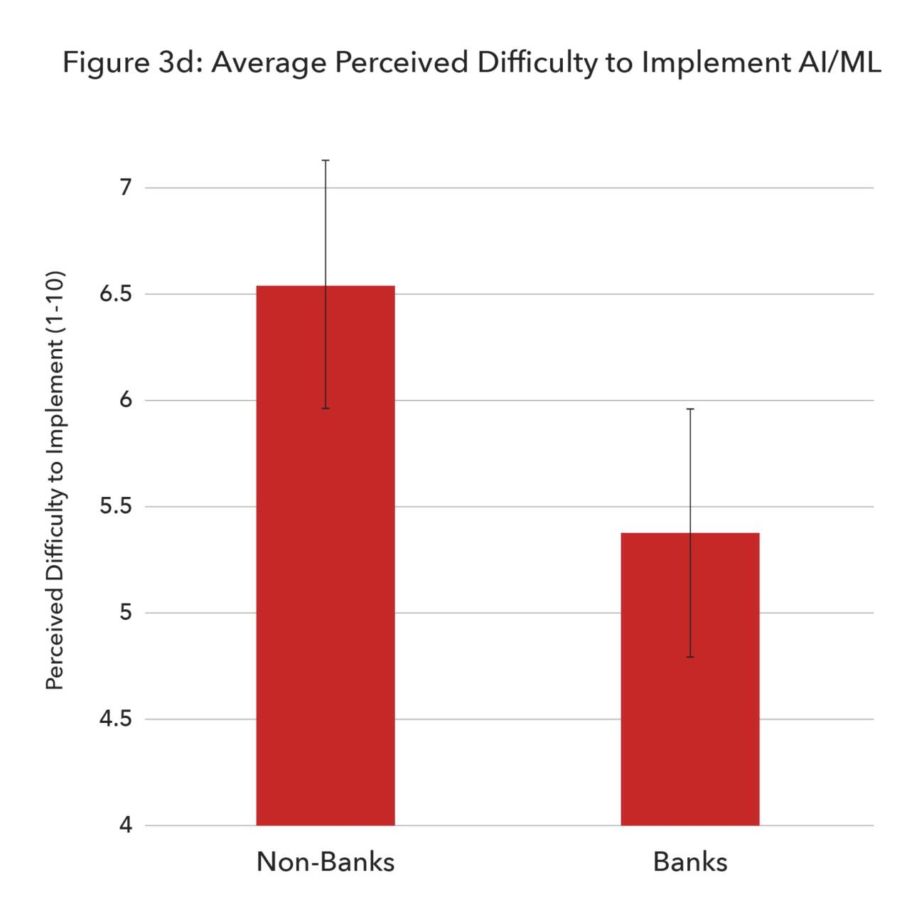 As can be seen in figure 3d, banks (n=19) view AI/ML as being less difficult to implement (p=0.0090) than non-banks (n=86). Several possible explanations could underpin this difference. Banks already possess immense amounts of data, thus eliminating, from their perspective, the added difficulty of needing data for AI to be useful. Another reason could be that banks are simply more skilled in this area, making implementation appear like a straightforward endeavour.