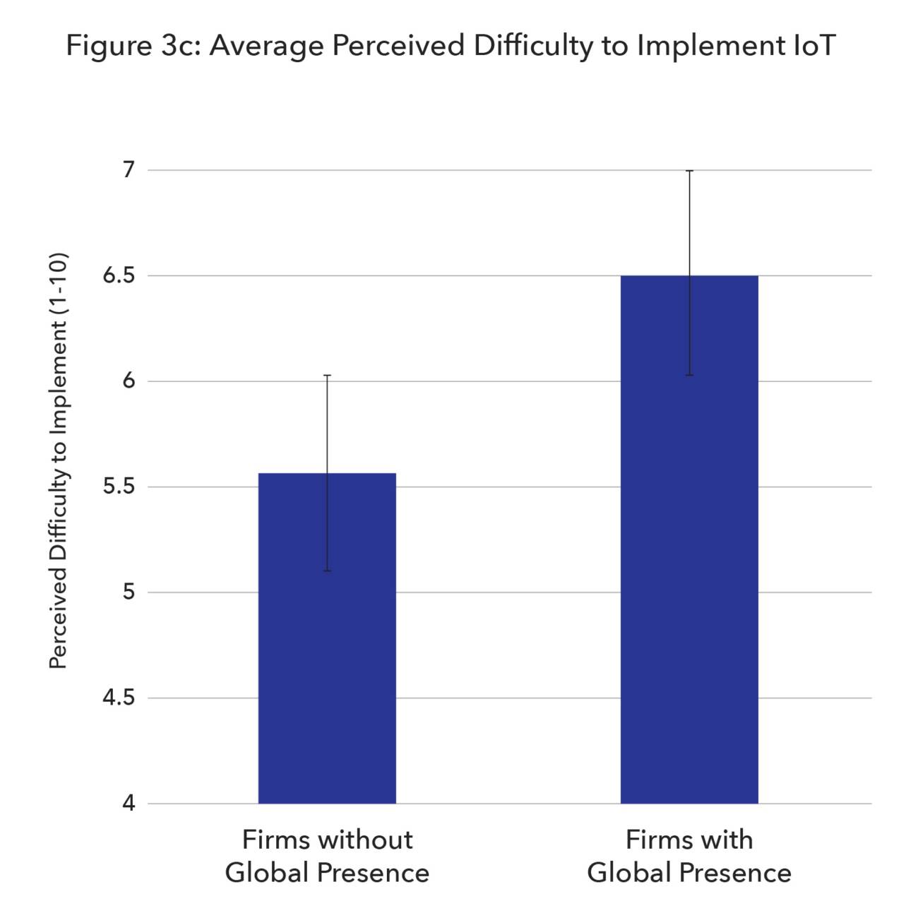 Firms with a global presence (n=51) view internet of things (IoT) as more difficult to implement (p=0.0227) than firms without a global presence (n=54). This difference could be attributed to the notion that global firms have a larger scale perception of what will be required to interconnect the entire ecosystem, making the task seem more monumental. Firms with a global presence were no more or less likely to be using IoT, and firms using IoT did not view it as more difficult to implement than those not using it.