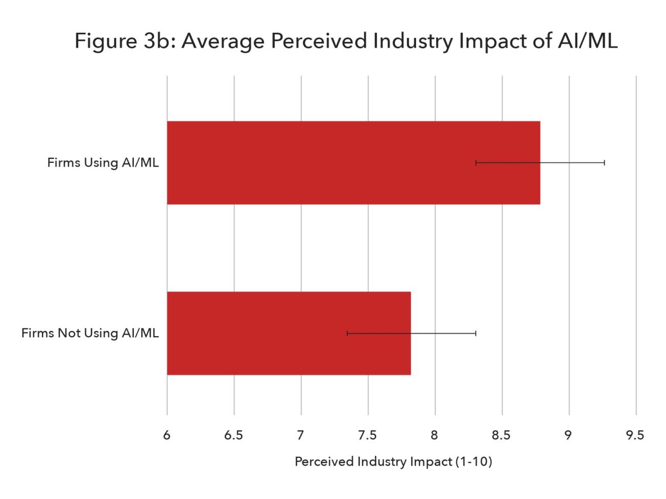 Firms using artificial intelligence and machine learning (AI/ML) (n=23) view AI/ML as having a greater impact (p=0.0407) than firms not using AI/ML (n=82). This difference could be attributed to several possibilities. One is that firms using AI/ML have an inside understanding of the true capabilities of the technology for the industry and are thus more optimistic. Another possibility is that the correlation runs in the opposing direction and that firms viewing AI/ML as having a strong impact are the firms most likely to have implemented the technology in their workflows.
